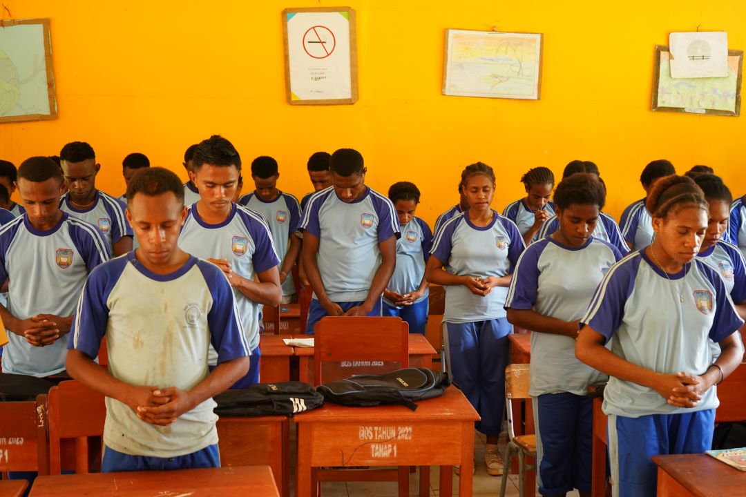 Para siswa melakukan doa bersama sebelum memulai kegiatan Edukasi Sosial